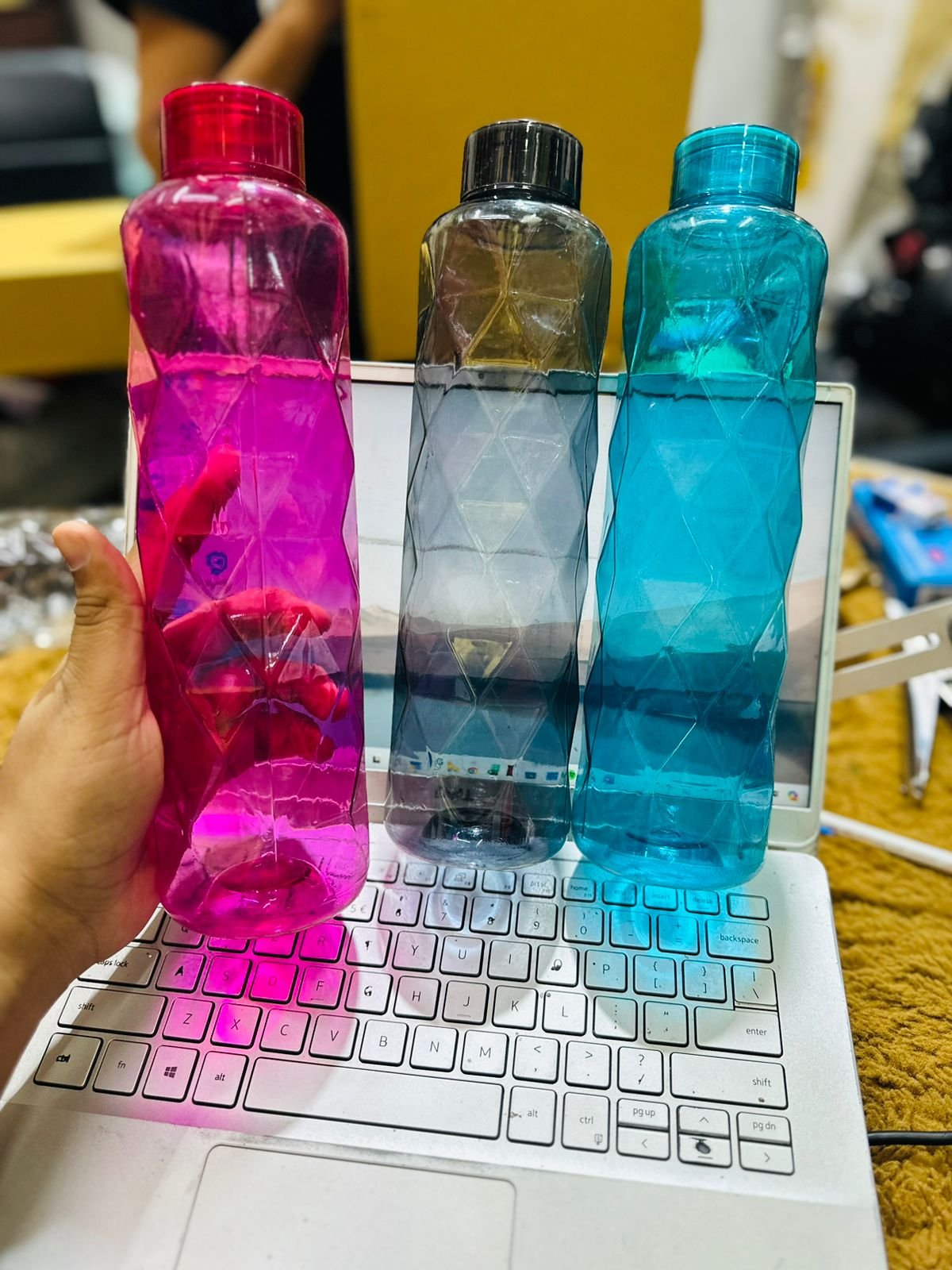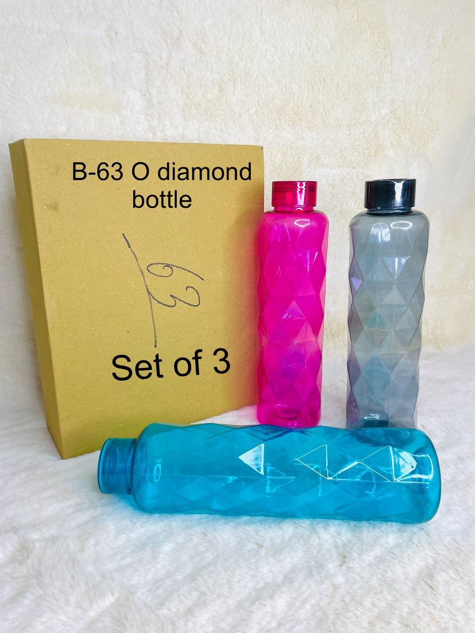 The B-63 O Diamond Bottle Set includes three stylish, diamond-textured bottles that combine elegance with practicality. Ideal for home or office use, these bottles are perfect for storing water or beverages while enhancing your table decor.