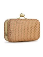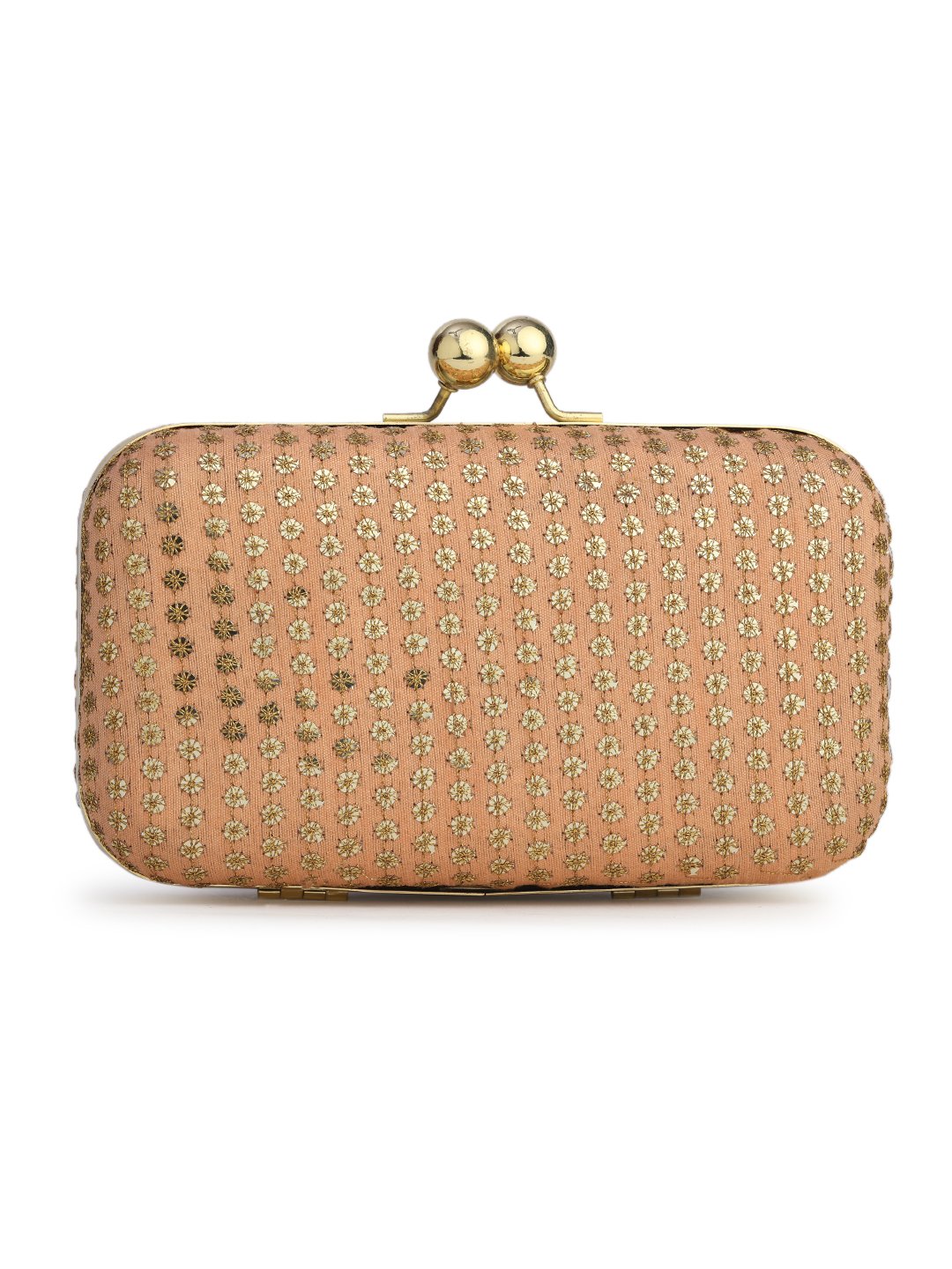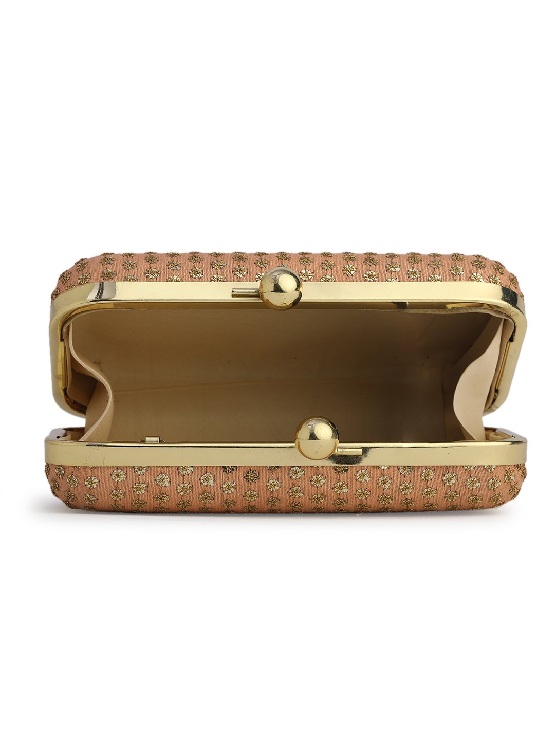 Peach & Gold Embroidered Box clutches, Has gold chain shoulder strap, 1 main compartment with Kiss closure