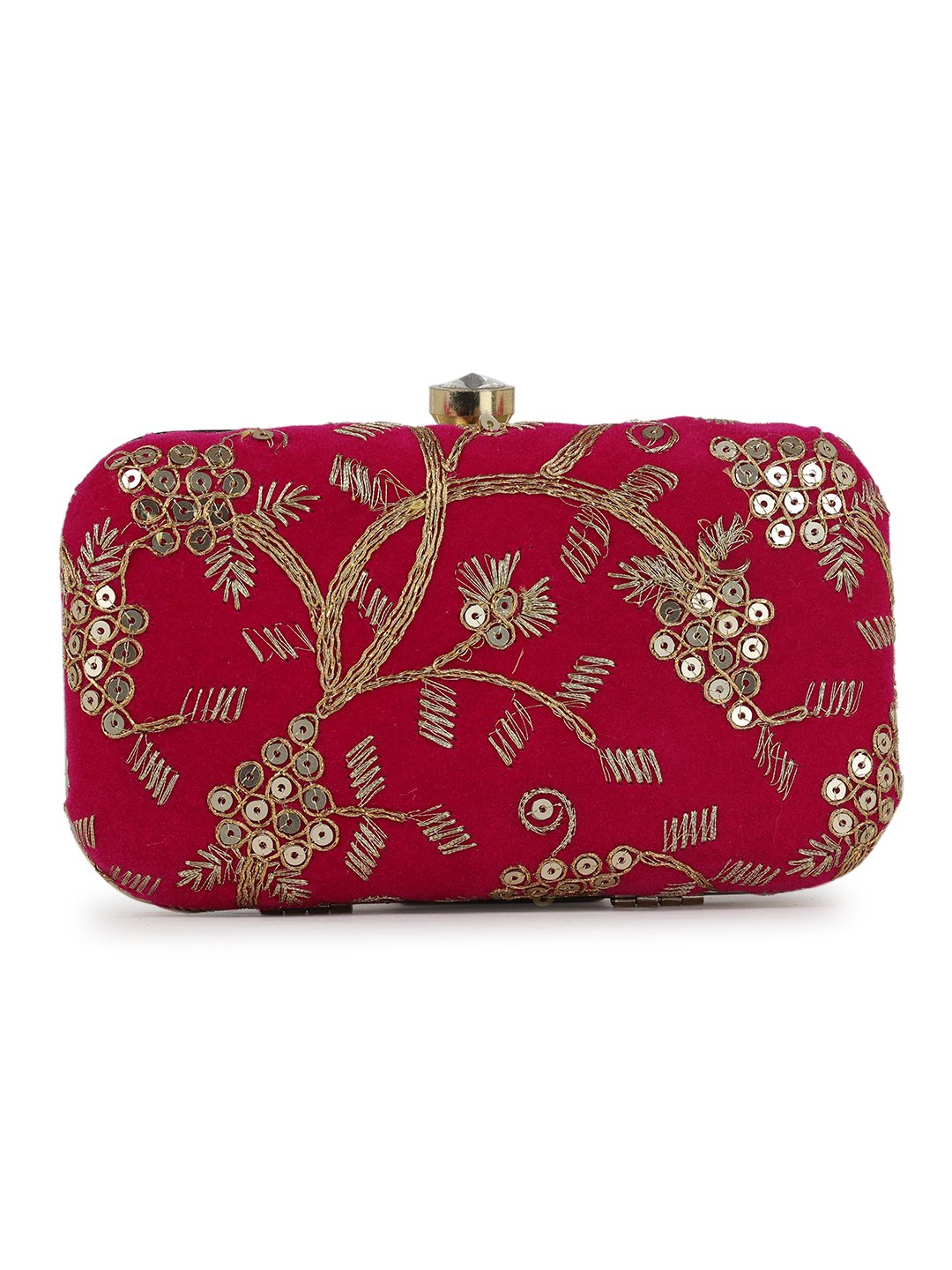 Pink Embroidered Box clutches, Has gold chain shoulder strap, 1 main compartment with twist closure