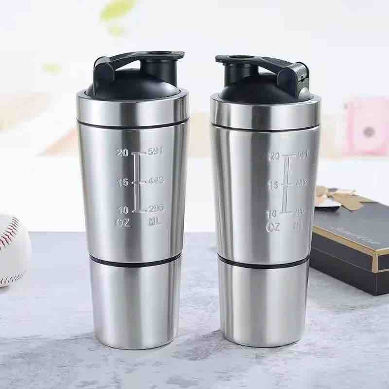 Durable and stylish, this Stainless Steel Gym Shaker is perfect for protein shakes and supplements, featuring a leak-proof lid, mixing mechanism, and odor-resistant, BPA-free construction.